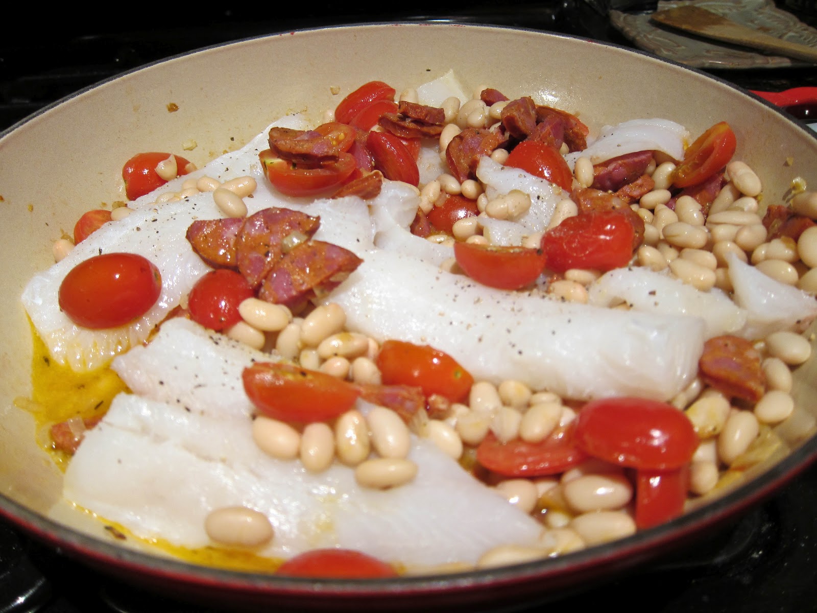 It's a terribly easy dish to throw together with little clean-up if you're able to use the same pan for stove top and oven. Also, you're able to use one cutting board & knife if you prep everything at once - first cut the veggies, then the chorizo, lastly the fish. I think the colors and smells from it make it seem much more sophisticated than it is. Which earns me major points in the wife/homemaker department. ;)
